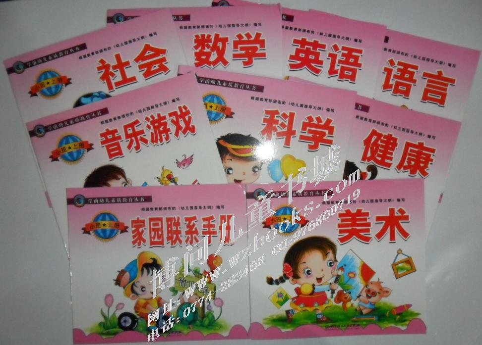 小班(每册套9本:英语、美术、数学、语言、音乐游戏、社会、健康、科学、家园联系手册)34.2元/册套,批发优惠价20元/套
