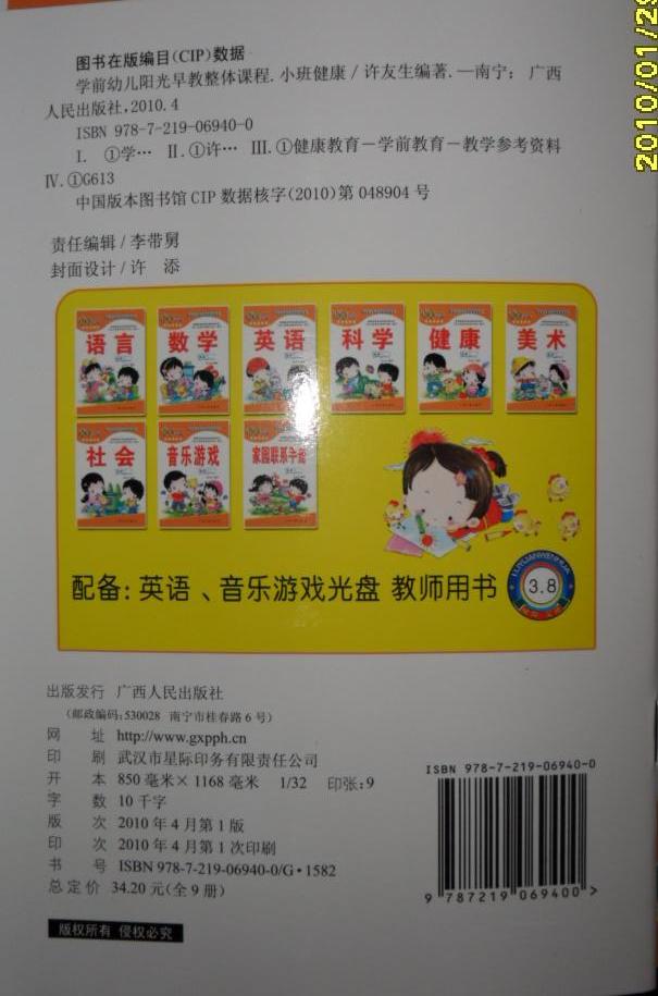 小班下册全套共9科:语言,数学,英语,科学,健康,美术,社会,音乐游戏,家园联系手册,每科本定价3.8元 配有英语,音乐游戏光盘及教师用书