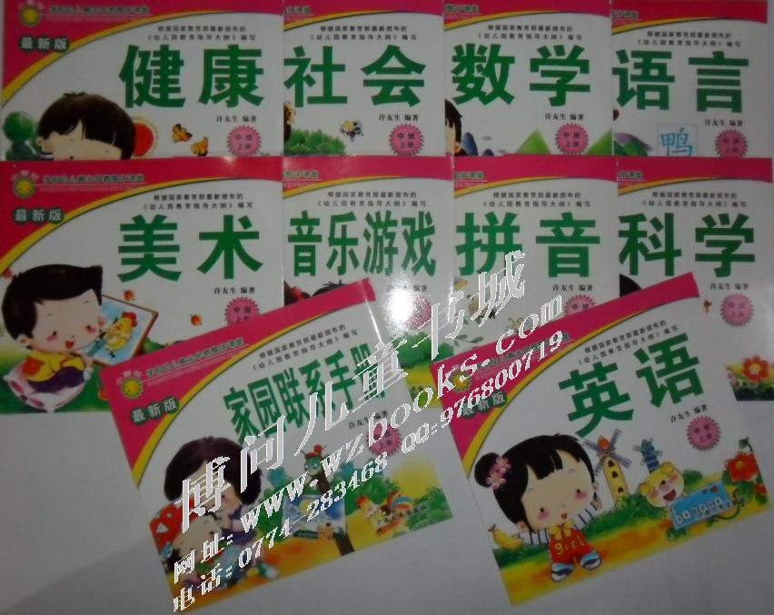 中班(每册套10本:英语、美术、数学、语言、音乐游戏、社会、健康、科学、拼音、家园联系手册)38元/册套;