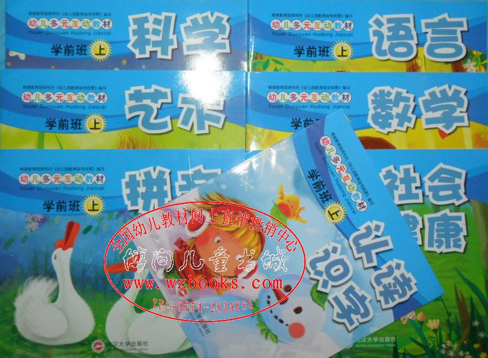 武汉大学出版社幼儿多元互动教材(张艾军主编)(24开)单本定价5元(全铜板纸高品质印刷塑封分上下册)大中小班塑封必选6本(语言、数学、艺术、科学、社会健康、认读识字)30元/册套,学前班塑封必选7本(语言、数学、艺术、科学、社会健康、认读识字、拼音)35元/册套,散装部分为可先科目:大中小及学前班:英语)(配备教师用书、教学挂图)