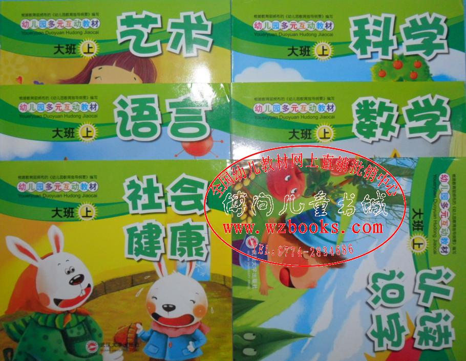 武汉大学出版社幼儿多元互动教材(张艾军主编)(24开)单本定价5元(全铜板纸高品质印刷塑封分上下册)大中小班塑封必选6本(语言、数学、艺术、科学、社会健康、认读识字)30元/册套,学前班塑封必选7本(语言、数学、艺术、科学、社会健康、认读识字、拼音)35元/册套,散装部分为可先科目:大中小及学前班:英语)(配备教师用书、教学挂图)