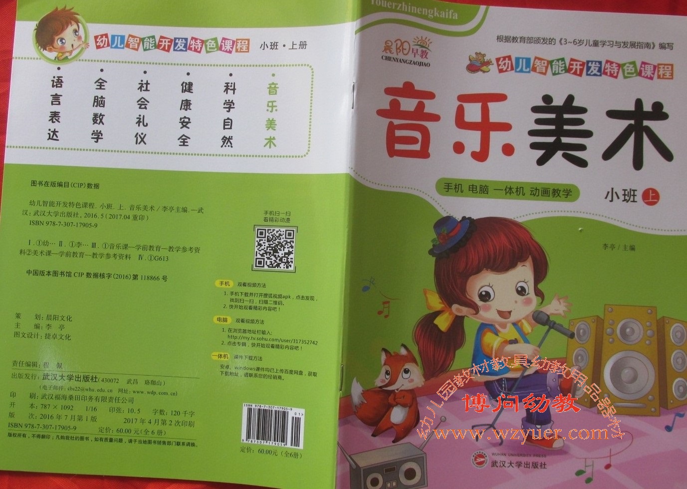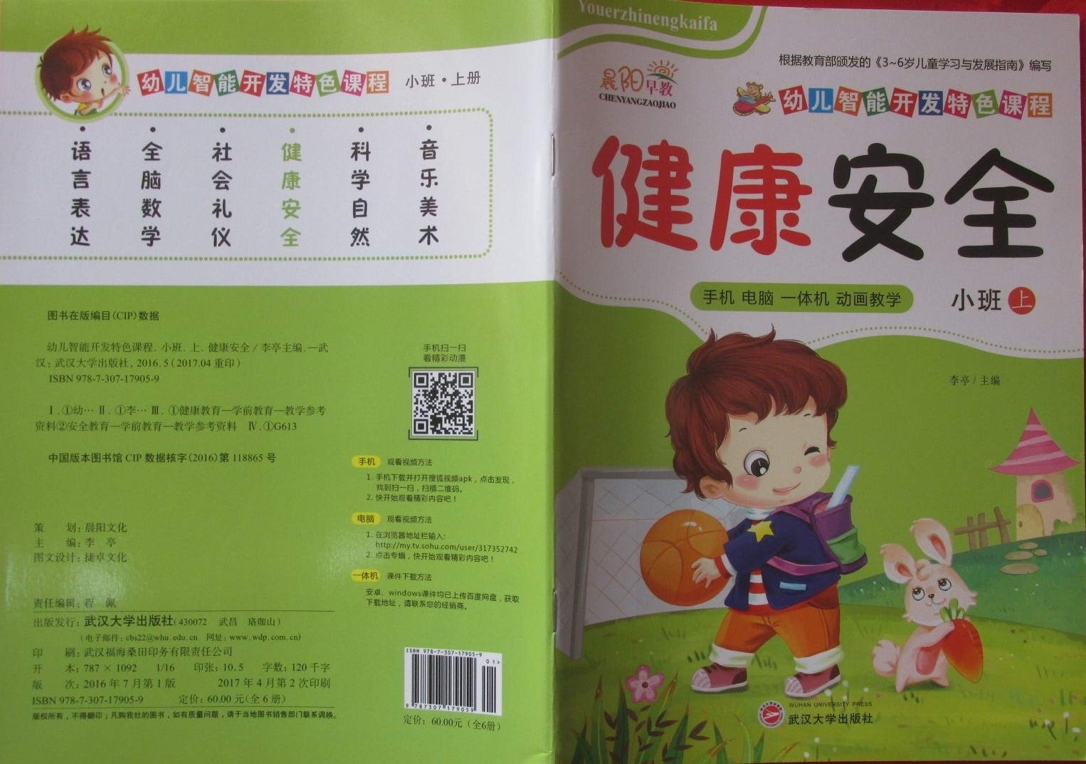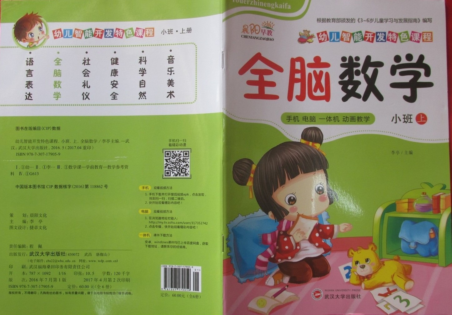 晨阳早教幼儿智能开发特色课程(含手机电脑一体机动画教学课件) 16开铜板纸印刷 分大中小班及幼小衔接班,分上下册,每册分六科六本书(语言表达、全脑数学、社会礼仪、健康安全、科学自然、音乐美术),每册套定价60元