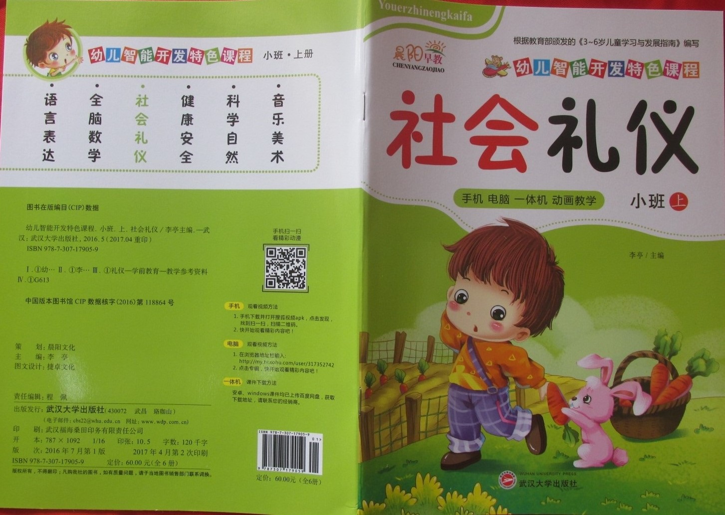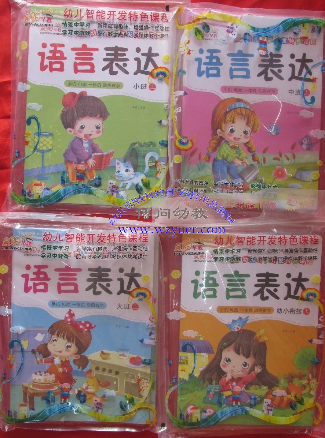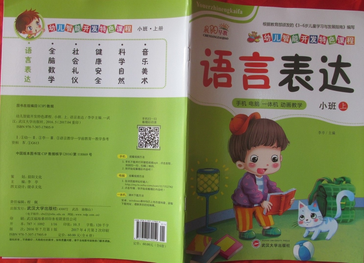 晨阳早教幼儿智能开发特色课程(含手机电脑一体机动画教学课件) 16开铜板纸印刷 分大中小班及幼小衔接班,分上下册,每册分六科六本书(语言表达、全脑数学、社会礼仪、健康安全、科学自然、音乐美术),每册套定价60元