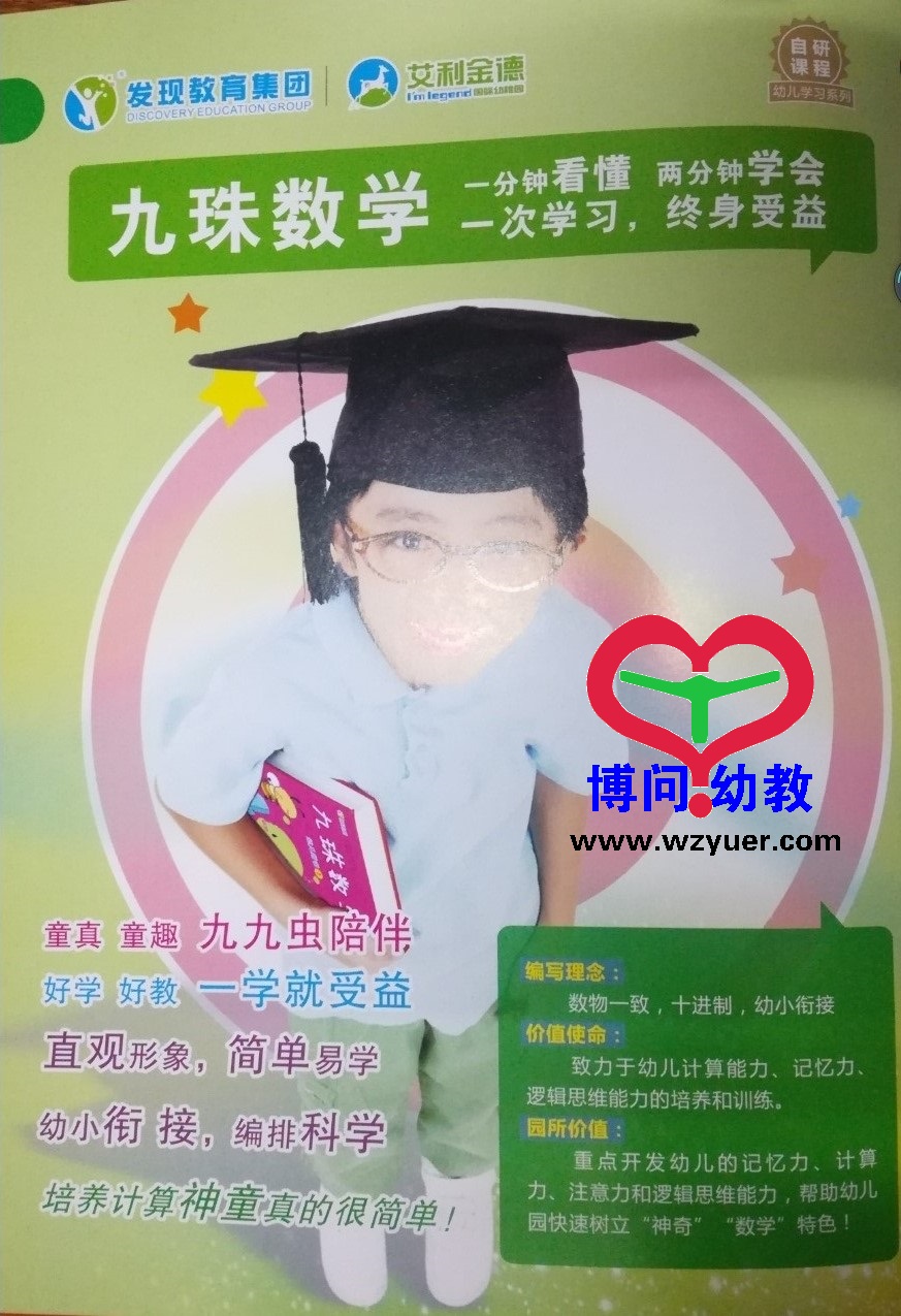 发现教育幼儿园特色课程《九珠数学》直观形象简单易教易学,幼小衔接,双手并用,全脑开发,主题故事教学,以趣导航,激发幼儿学习兴趣!获三项国家专利,突出的学习效果,助力赢口碑扩生源! 每套定价49.8元。 (含入园培训,有专业的教研,组织九珠大赛,效果展示会)
