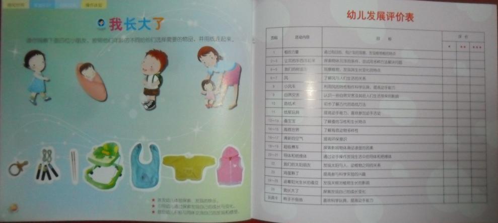 托班分四科,大中小班及学前班分六科:语言表达、数学操作、科学探索、社会与健康、音乐欣赏、美术创作