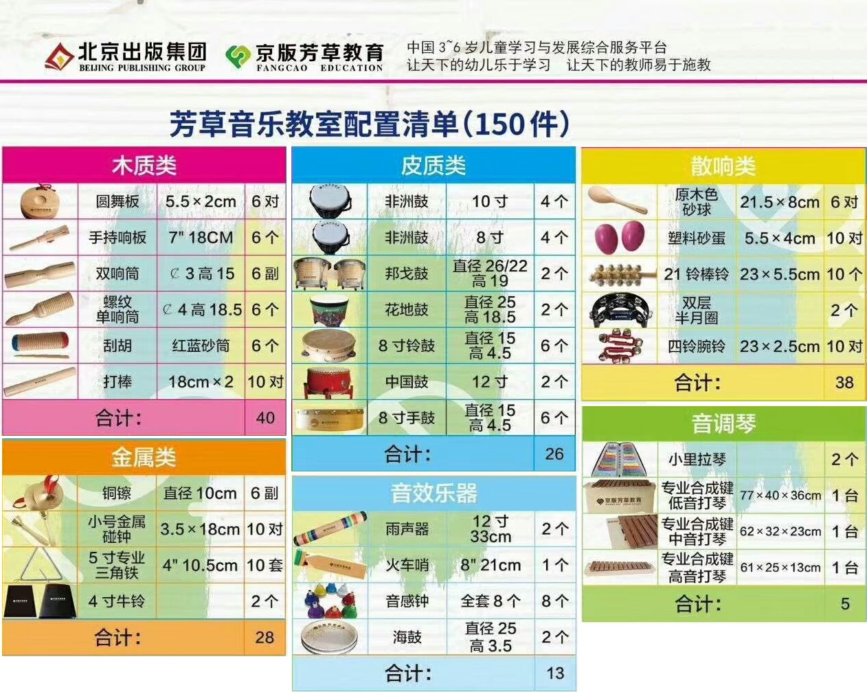 图书目录: 配套芳草教育音乐教室(木质教具40件、皮质鼓类26件、散响类38件、金属类28件、音效乐器13件、音调琴5件)(价格15000元)