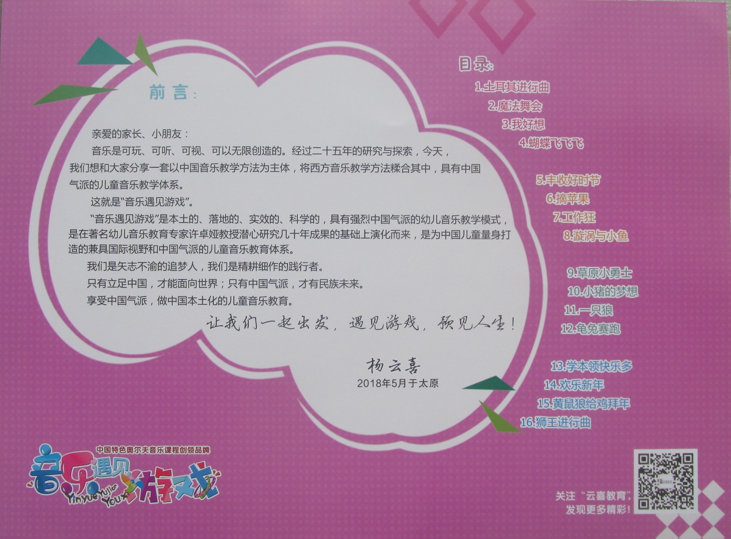 云喜教育中国幼儿园音乐课程领军品牌,许卓娅著名幼教专家引领、专业团队、专心服务。专业打造国内幼儿园顶级高端音乐特色课程《音乐遇见游戏》《非洲鼓-敲敲乐》《幼儿情境戏剧》。遇见云喜音乐游戏,预见美好人生!