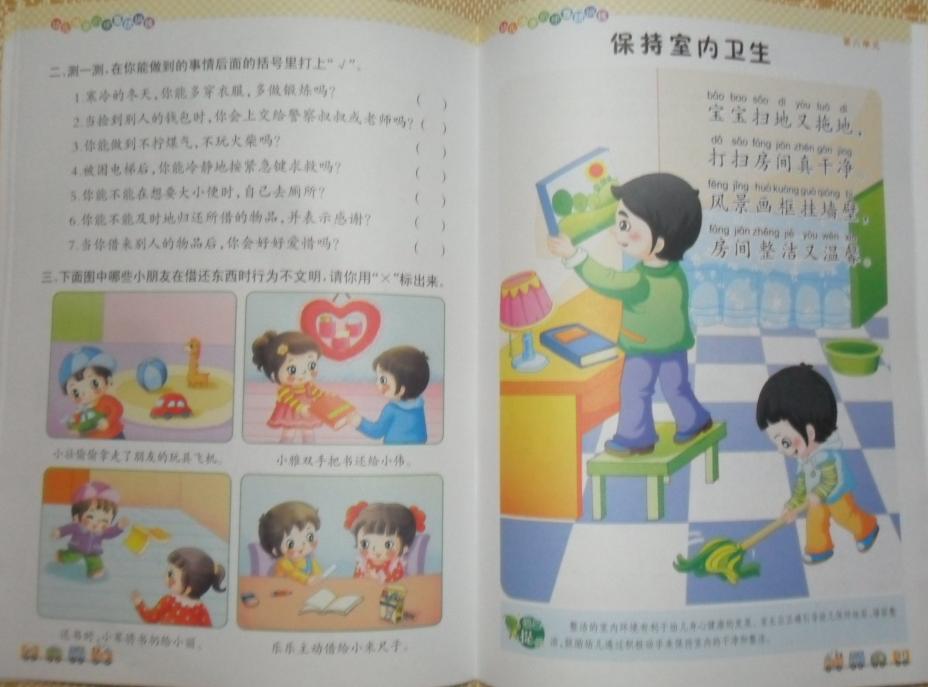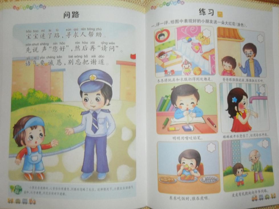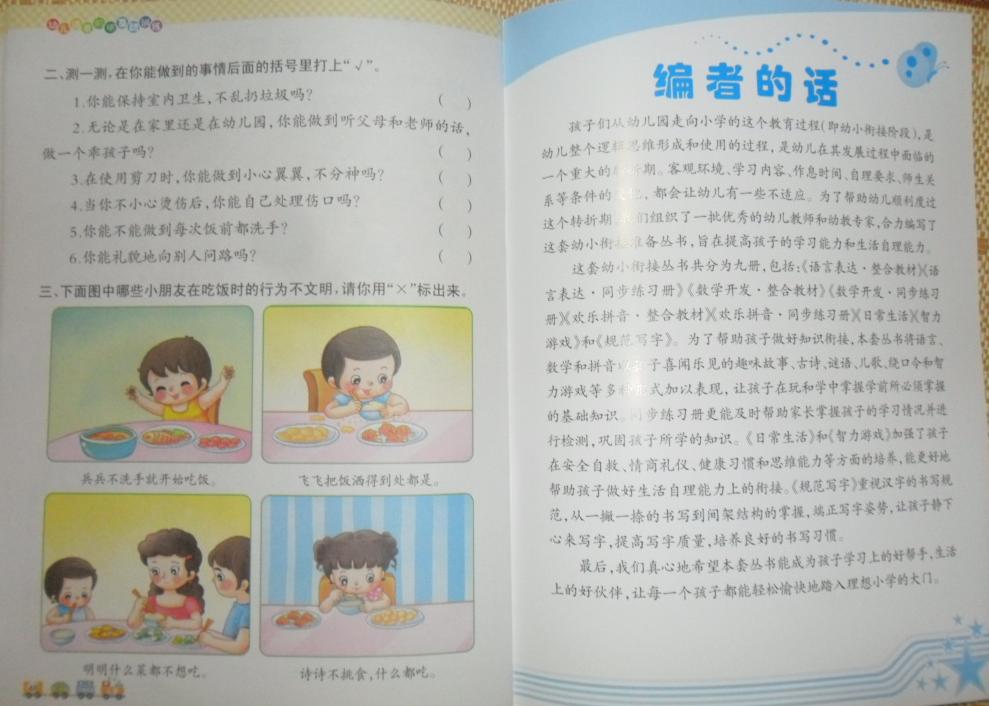 每册套9本:语言表达综合教材、数学开发综合教材、欢乐拼音综合教材、日常生活、智力游戏、规范写字、语言表达同步练习册、数学开发同步练习册、欢乐拼音同步练习册。每本定价9.9元,每册套总定价89.1元
