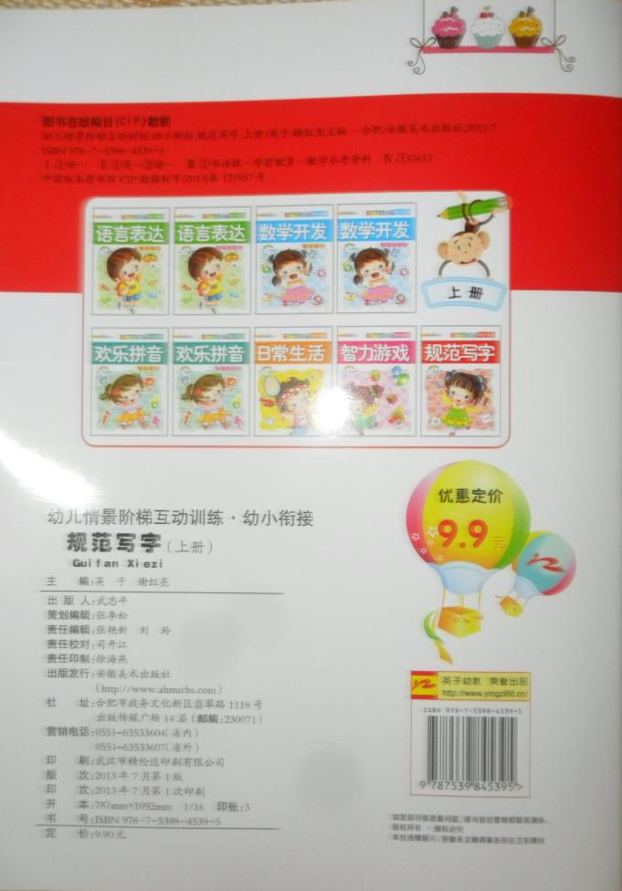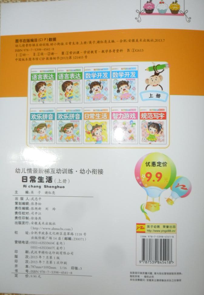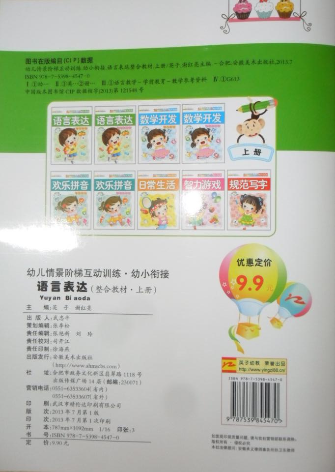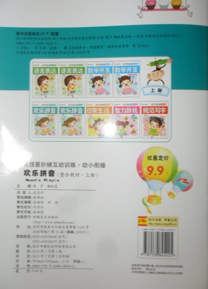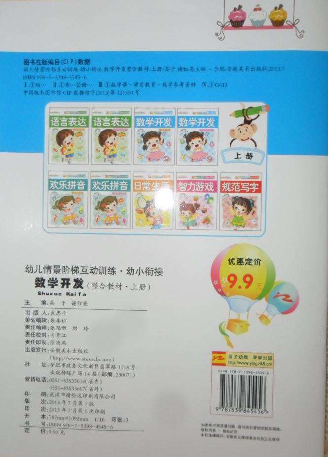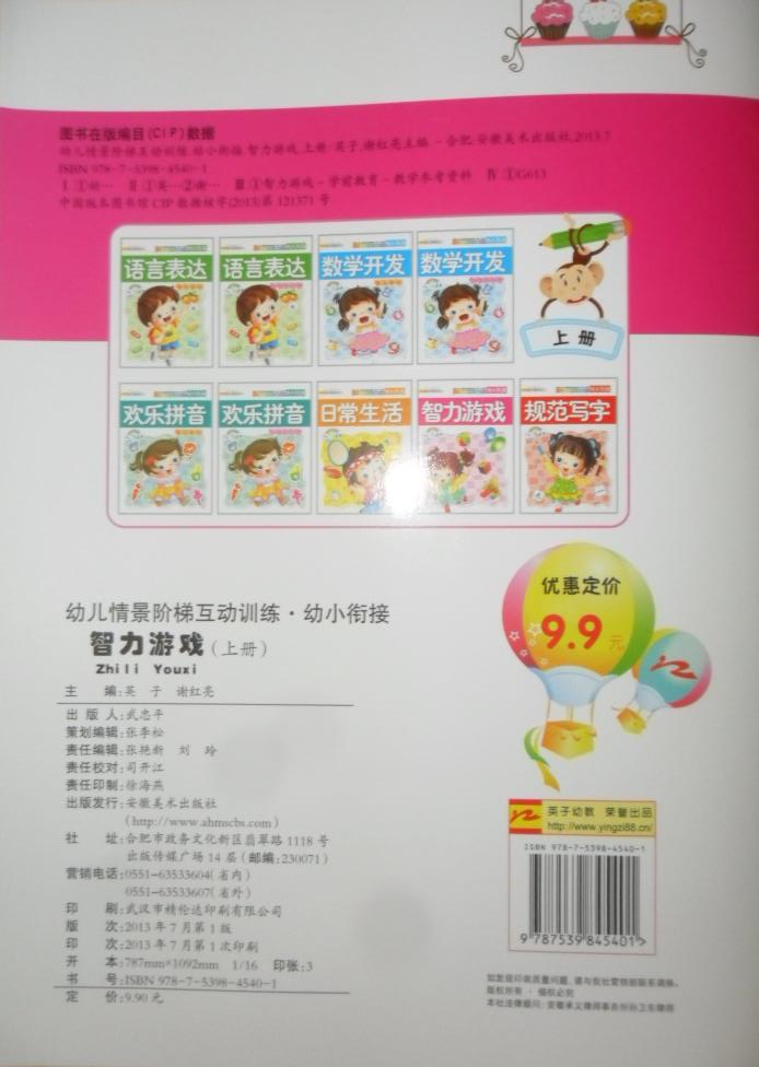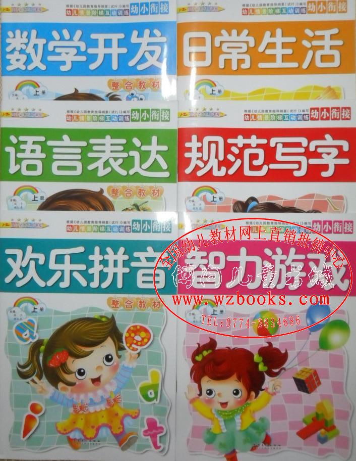 每册套9本:语言表达综合教材、数学开发综合教材、欢乐拼音综合教材、日常生活、智力游戏、规范写字、语言表达同步练习册、数学开发同步练习册、欢乐拼音同步练习册。每本定价9.9元,每册套总定价89.1元
