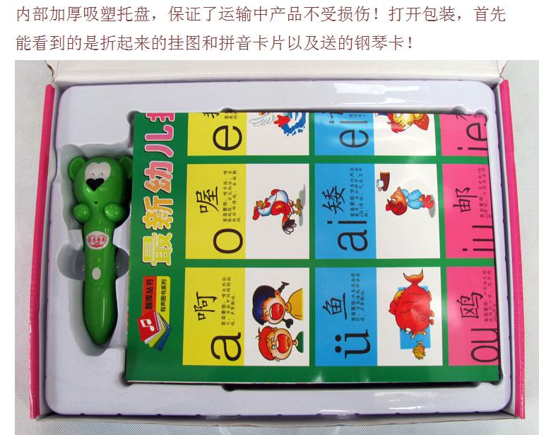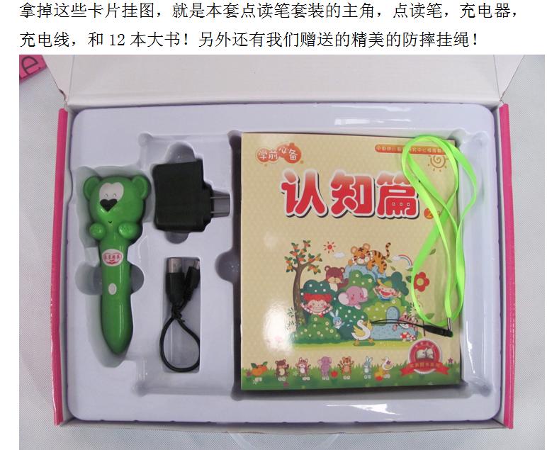 配置清单:点读笔一个,充电器,充电线,标配图示16本大书(19X21厘米,厚度20页)6张挂图,1张钢琴卡,1张字母音标卡,1张MP3功能卡,防摔挂绳,保修卡,说明书,彩盒!