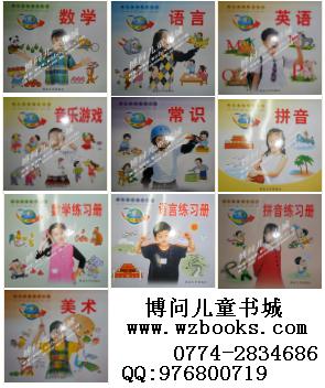 美术、数学、语言定价3.6;英语、音乐游戏、常识、数学练习册、语言练习册定价3.4,总定价34.60元/册套,批发优惠价19元/册套