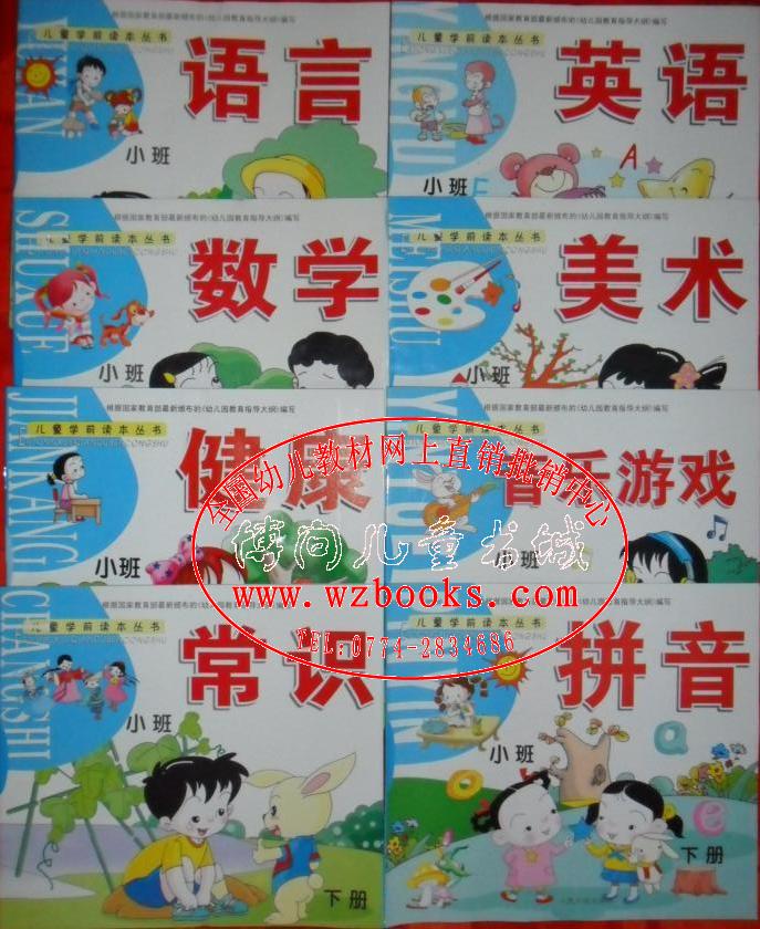 (分上下册,每册定价3.8元)24开,大中小班(每册套8本:语言,数学,美术,常识,音乐游戏, 健康,英语,拼音);学前班(每册套11本:语言,数学,美术,常识,音乐游戏, 健康,英语,拼音,语言练习册,数学练习册,拼音练习册)。
