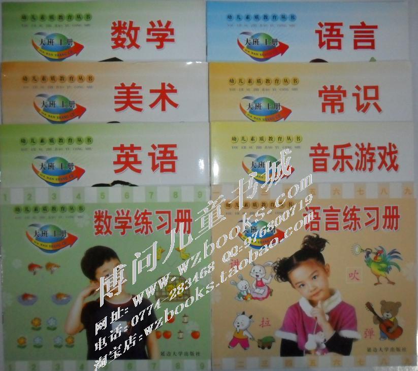 延边大学出版社《幼儿素质教育丛书》(幼儿园教材)(分上下册,每册定价: 3.4元)大班(每册套8本:美术、数学、语言、英语、音乐游戏、常识、数学练习册、语言练习册)